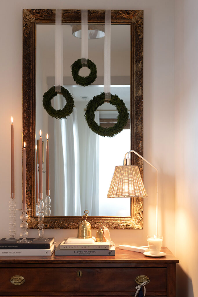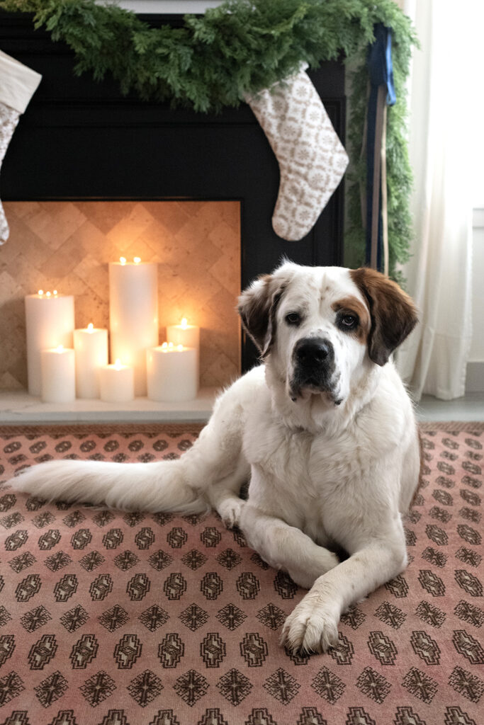 For my holiday decor this year, I took color inspiration from the vintage rug in my living room, and went all in on the brass bells, colorful ribbon and taper candles, and of course my favorite velvet stockings. It provided such a cozy & warm setting to curl up and watch holiday movies, and Margo appreciated it too.